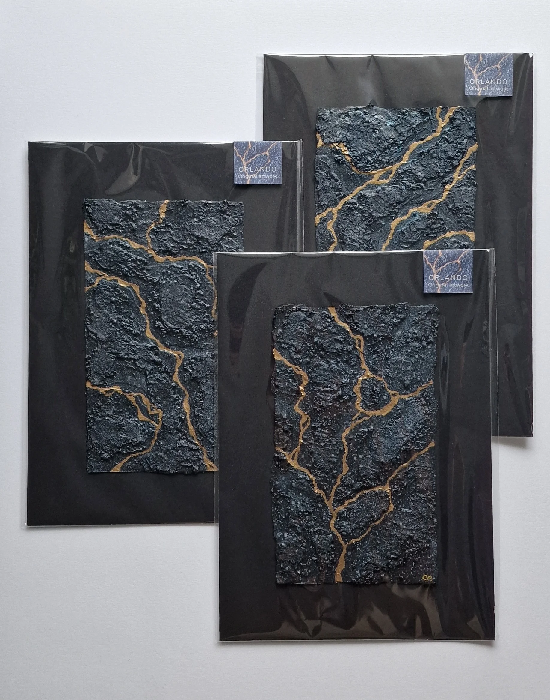ORLANDO is a series of original textured acrylic paintings, each of them independent and hand-painted (not a print) on 100% Cotton Rag acid free Khadi Paper and mounted on A4 mountboard.